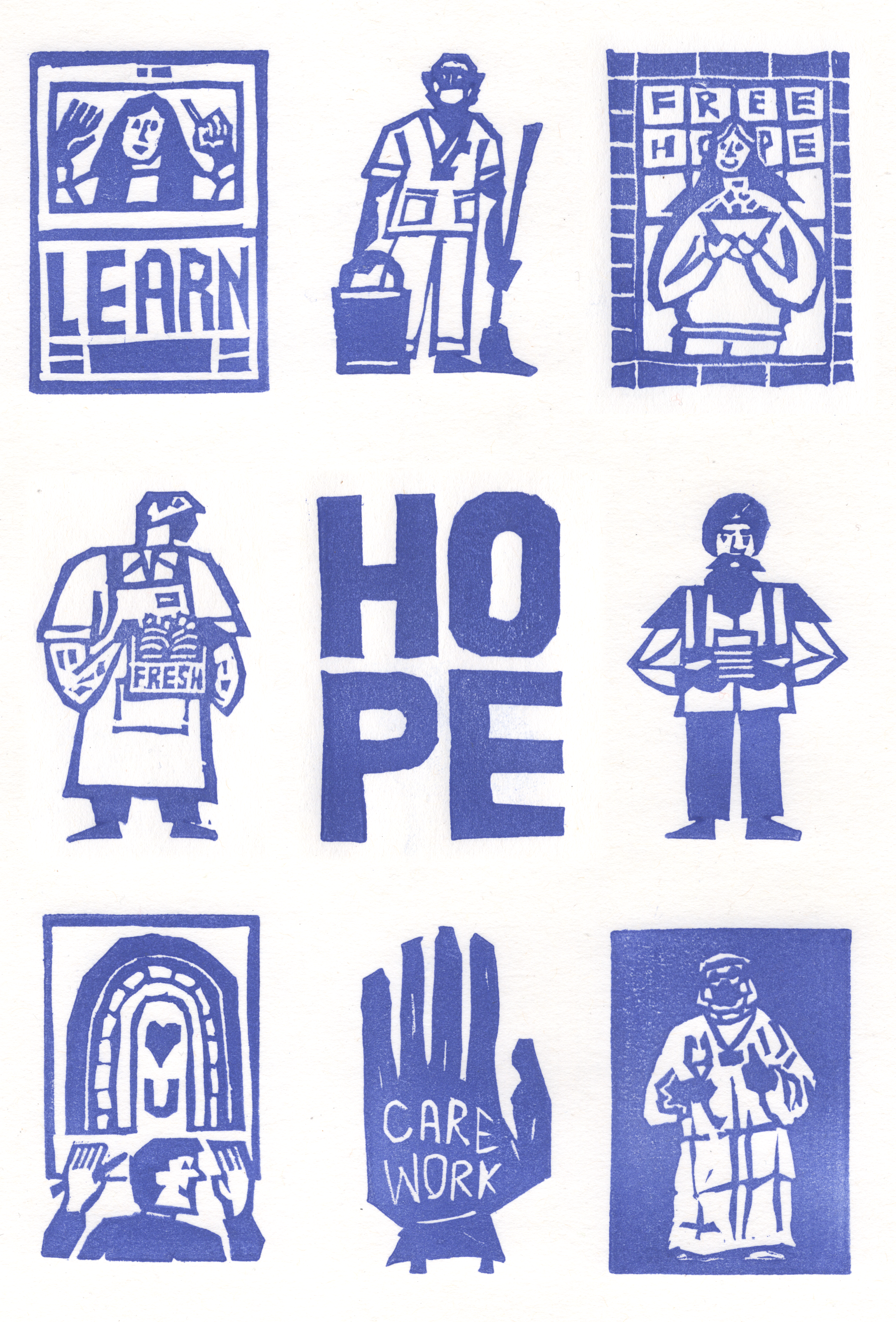 Process: Linocut is an intricate craft with a rich folk history and roots in activism. It is a more time consuming process than digital work due to cutting/inking/drying times, but highly bespoke, textured and powerful in its communication.